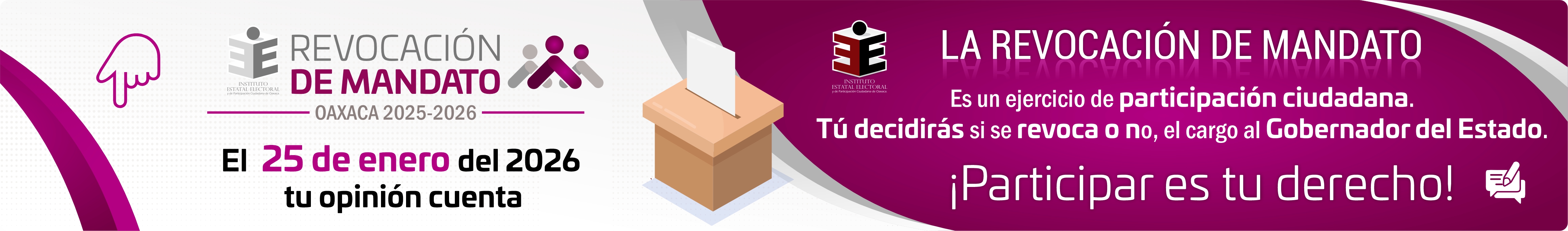 El proceso de revocación de mandato es el mecanismo solicitado por la ciudadanía oaxaqueña, para determinar la conclusión anticipada en el desempeño del cargo de la persona titular de la Gubernatura del Estado, a partir de la pérdida de la confianza. Lo anterior, de conformidad con el artículo 5 Ley de la Revocación de Mandato para el Estado de Oaxaca, así como el decreto 753 por el que reformas diversas disposiciones de la Constitución Política del Estado Libre y Soberano de Oaxaca, en materia de Consulta Popular y Revocación de Mandato, y el decreto 754, por el que se reforman diversas disposiciones de la Ley de Revocación de Mandato para el Estado de Oaxaca. Ambos publicados en el periódico oficial del estado de Oaxaca el 10 de septiembre de 2025. |